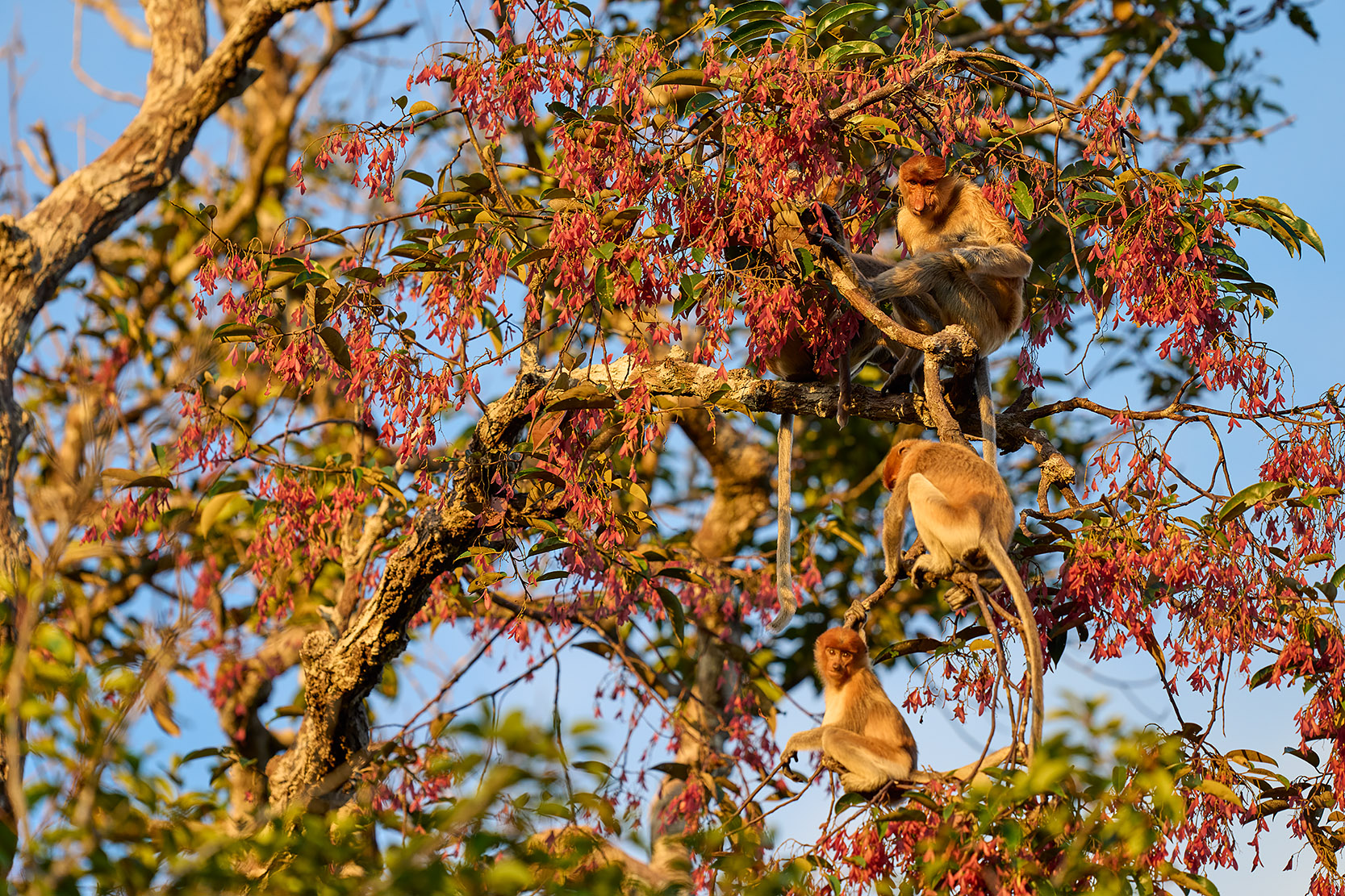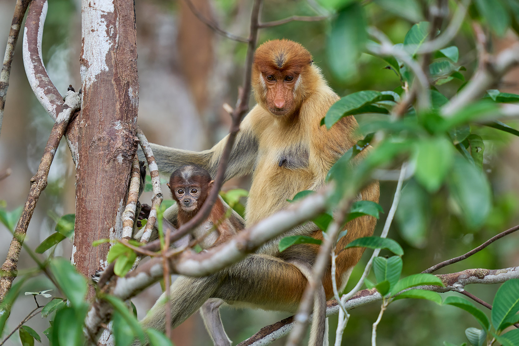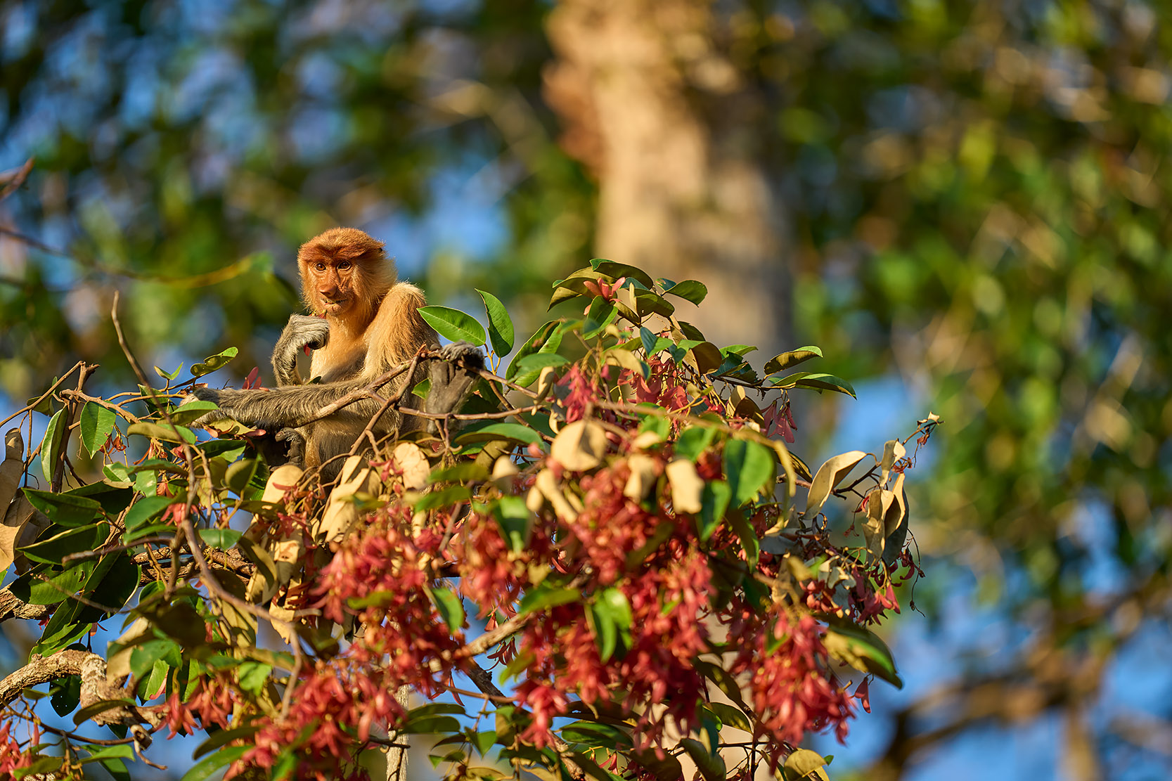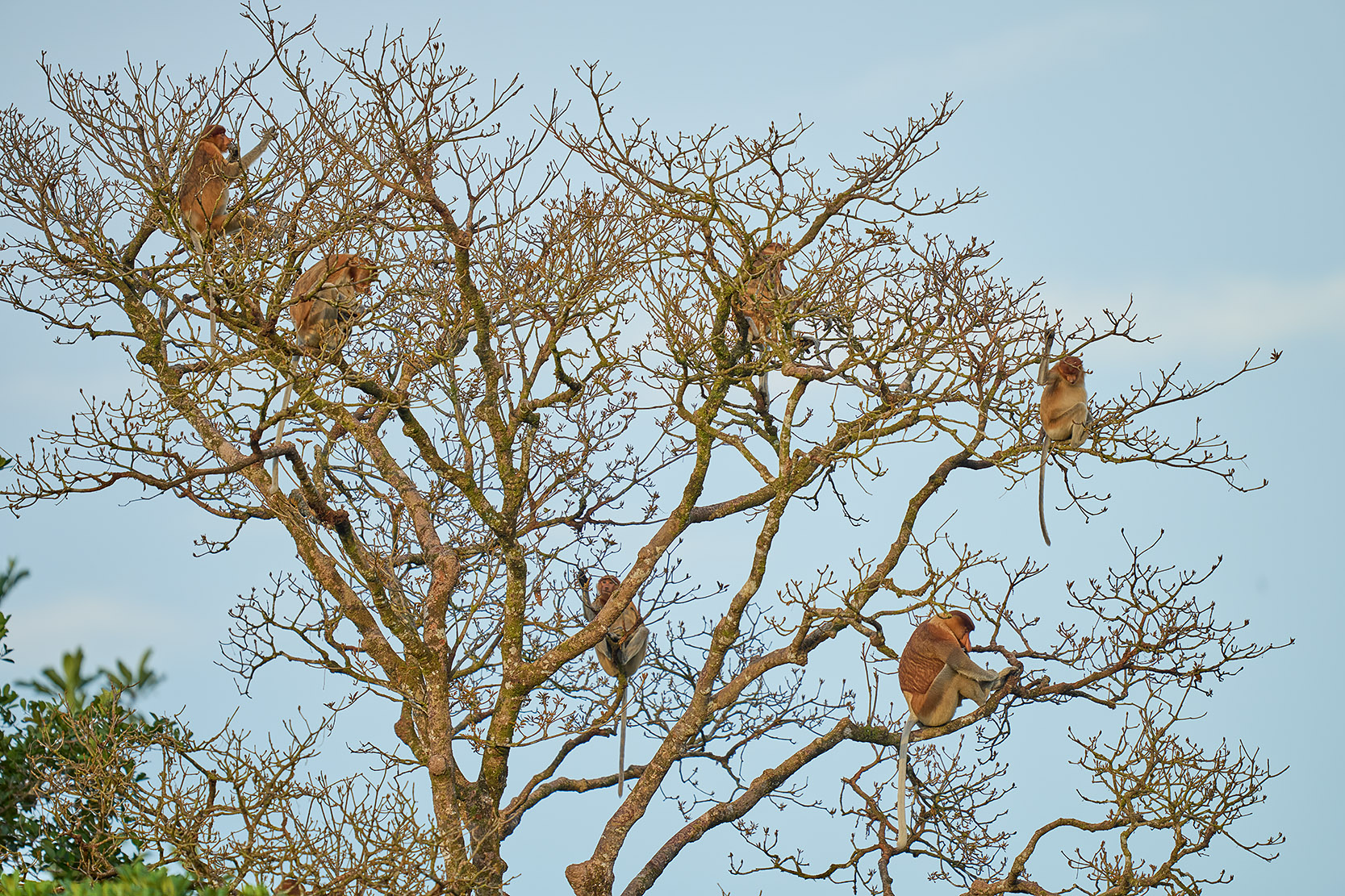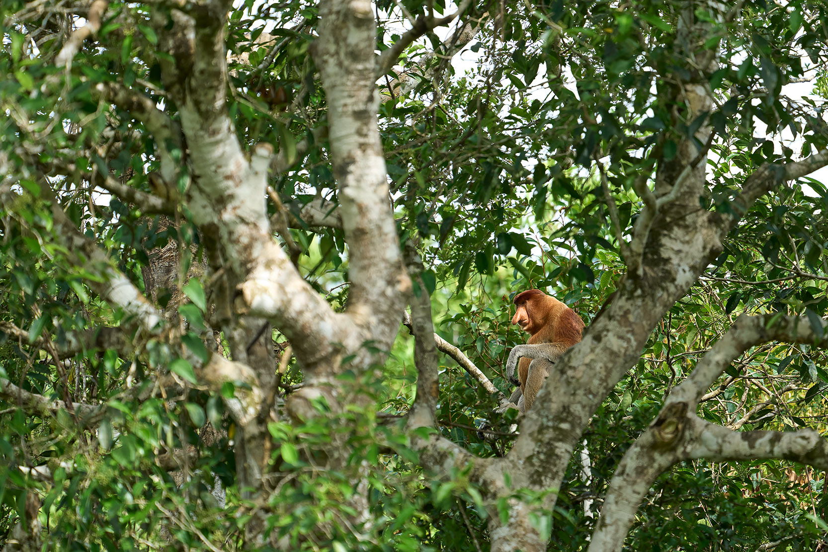 Kahau nosatý, známý také jako proboscis monkey, je jeden z nejvýraznějších primátů Bornea. Na první pohled zaujme svým velkým, nápadně podlouhlým nosem, který je největší u dospělých samců. Tito opice žijí převážně v mangrovových a pobřežních lesích, kde výborně skáčou i plavou – patří dokonce mezi nejlepší plavce mezi primáty. Živí se listy, výhonky a ovocem, které nacházejí v husté vegetaci. Jejich populace však klesá kvůli úbytku přirozeného prostředí, takže se řadí mezi ohrožené druhy.